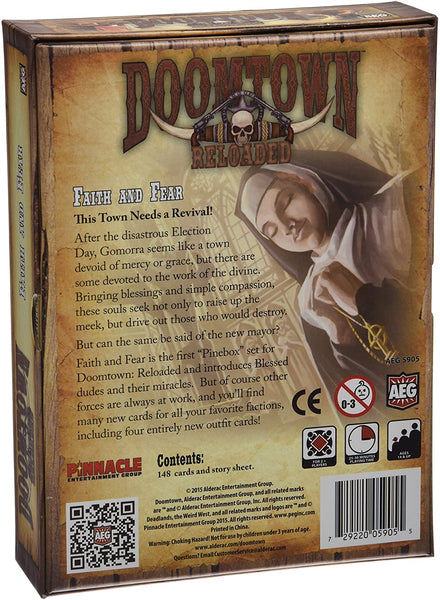 Gomorra needs a Revival! After the disastrous Election Day, Gomorra seems like a town devoid of mercy or grace, but there are some devoted to the work of the divine. Bringing blessings and simple compassion, these souls seek not only to raise up the meek, but drive out those who would destroy. But can the same be said of the new mayor? Doom town: Reloaded is a fast‑paced expandable card game set in the Dead lands universe of gun slingin', spell slingin' and mud-slingin'! 148 Cards in an all new Pine Box expansion! Faith and Fear is the first "Pinebox" set for Doom town: Reloaded and introduces the new Blessed dudes and their miracles. But of course other forces are always at work, and you'll find many new cards for all your favorite factions, including four entirely new outfit cards.